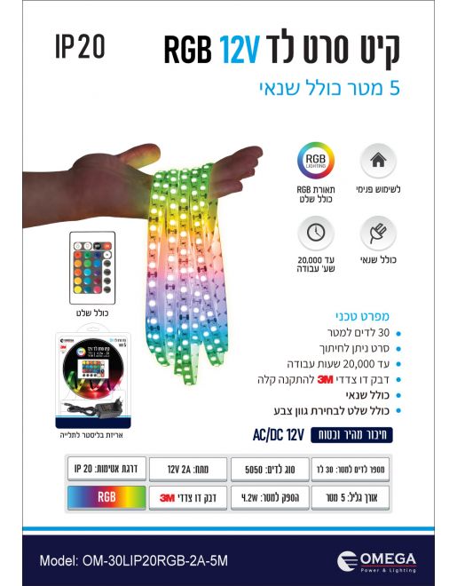 קיט סרט לד 5 מטר IP20 RGB 4.2W 12V2A מבית Omaga